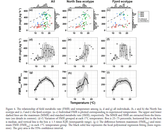 The relationship between physiology and temperature has a large influence on population-level responses to climate change. In natural settings, direct thermal effects on metabolism may be exaggerated or offset by behavioural responses influencing individual energy balance. Drawing on a newly developed proxy, we provide the first estimates of the thermal performance curve of field metabolism in a wild fish. We investigate the thermal sensitivity of field metabolic rate in two sympatric, genetically distinct ecotypes of Atlantic cod from the Skagerrak coast of southern Norway. The combined ecotype median of field metabolic rate increased with increasing temperature until around 16°C, coincident with the thermal optimum for growth for juvenile Atlantic cod. Individual cod experienced temperatures in excess of the thermal optimum for field metabolic rate, indicating some degree of thermal limitation of field metabolism in a complex natural environment with the potential for thermal refugia. The two cod ecotypes showed different thermal performance curves for field metabolic rate, revealing that genetic components to temperature sensitivity persist beyond acclimation effects. The cold-adapted fjord ecotype maintained higher field metabolic rates at cooler temperatures than the warm-adapted North Sea ecotype, which showed clear preference for warmer waters around the thermal optimum. Field metabolic rates of the two ecotypes were strongly influenced by year and location of sampling, implying more complex behavioural responses to environmental conditions. We emphasise that the energy uses reflecting physiological conditions in the field should be considered in the evaluation of the effect of climatic variables on fish population dynamics and demonstrate that otolith isotopes provide an analytical framework to answer this question.